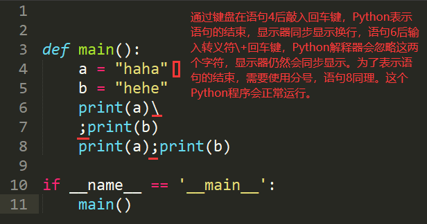 在Python中,回车键表示语句的结束,(有些编程语言不是这么认为的,SQL语句中以分号表示语句的结束),可以在回车键之前加上转义符\转义,让Python解释器认为该回车键不再表示语句的结束,当做普通字符,此时可以用分号表示语句的结束。显示器从键盘同步收到该回车键字符时,会显示换行(显示器遇到字符a,b,c等时会直接显示该字符),即使遇到转义字符\,显示器也会原样输出显示,也就是说,转义字符只对Python解释器有特殊意义,显示器认为转义字符和普通字符a,b,c等没有什么区别