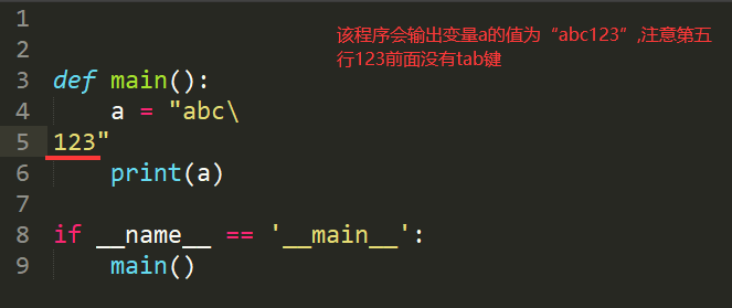 2. a = “abc\ + enter键+123”,在enter键之前加上转义符,则Python解释器不会认为语句结束,同时忽略掉\+enter键,继续等待输入,显示器则会正常输出显示转义符\,并换行显示enter键,等变量赋值完成后,Python解释器不会把转义符和enter键这个字符输出到内存变量中(Python解释器把这两个字符忽略掉了),也就是说变量a没有enter键这个字符,输入完成后,变量a的值为”abc123”,交换式输入和文件输入效果一样。