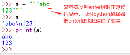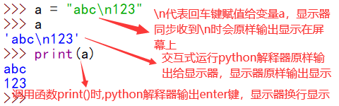 3. a = “abc\n123” 为了把回车键当成一个字符保存给变量,所以Python使用了\n字符,给a赋值时,显示器直接显示\n字符,不会换行,当输出变量a时,显示器是显示\n字符,还是把\n转换成换行显示,不同的方式效果不一样,交互式直接输出a时,显示\n,交互式或文件中调用函数print(a)函数输出时,显示换行