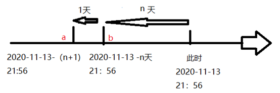 1. 当value不带加减号时,表示文件的atime属性为距此时value天和value+1天的时间区间内时,符合查询条件如图中所示,当文件的atime属性值位于时间点a—b之间的区间内时,符合查询的条件,文字描述为据此n天。